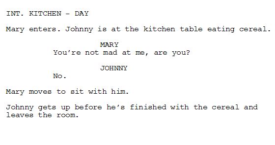 Here’s where we remember the cardinal writing rule of Show, Don’t Tell. It’s much more interesting to see action scripted out, happening before us, than to have some character explaining it. Johnny’s dialogue here becomes an info dump — blurting out a series of events in an unnecessarily long rant. It is so dull to hear a character explain things that should have just unfolded on screen.