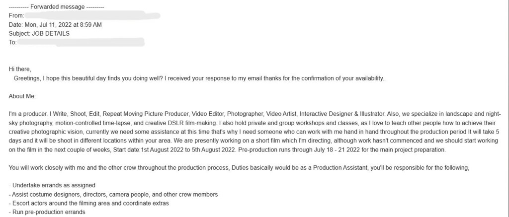 A lot of the work I did alongside all this was networking, meeting people for coffee, doing casual fun things with fellow filmmakers, helping out on friend’s sets, speaking to students and film clubs, and even writing this blog. Self-promotion is a big deal in addition to applying for jobs. Networking is the glue that holds it all together.