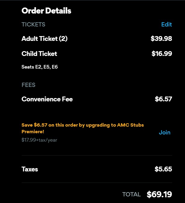 This is the cost for AMC Madison Yards for 6pm on 1/3/2026