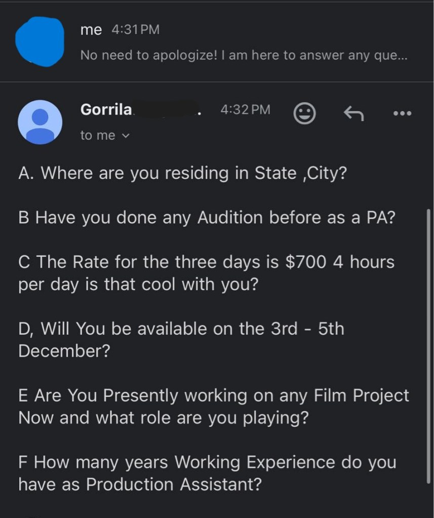 - Audition – for a production assistant? Oh no honey. But this detail confirms my suspicion that this was also a copy & pasted scam for an actor as well. Remember how the job post was a “Casting Call”? I bet this same scam showed up elsewhere targeting actors or models.