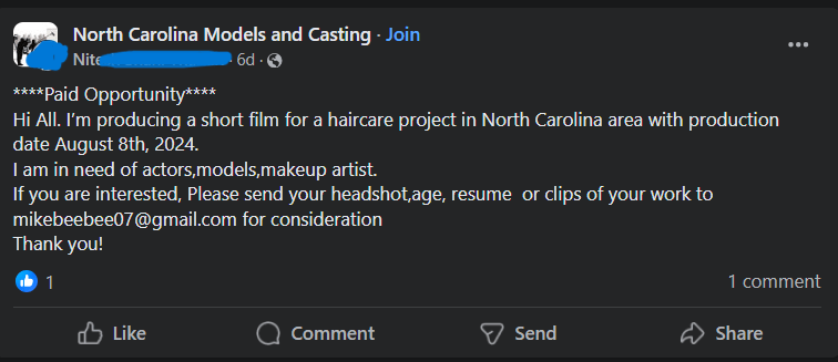 This is how the check phishing scam works. They issue you a fake check, and before your bank notices the check is fraudulent, you’ll be issuing a check from your own balance to pay the “talent” who is actually the scammer. You are out at least $4,000 at the end of this scam.