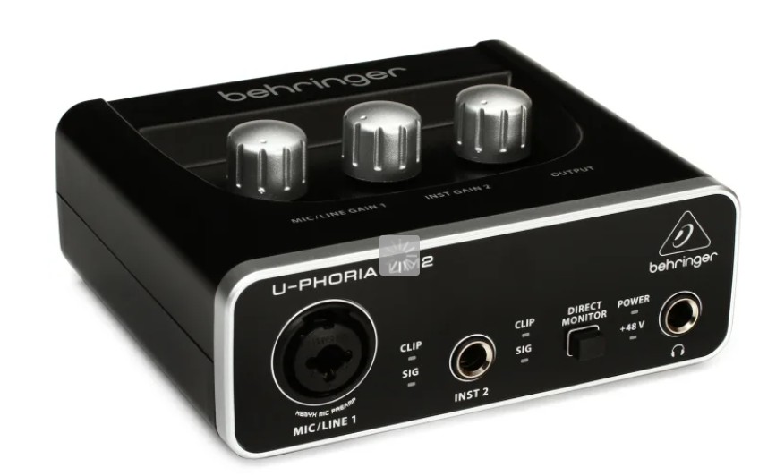 An example of an audio interface. Note the two plug in ports for XLR cables, the separate knobs to control levels, etc.