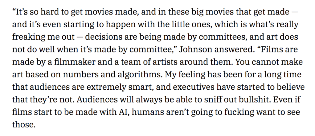 I’d love to see more originality in the movie theater. The problem is — those movies have a harder time finding an audience.